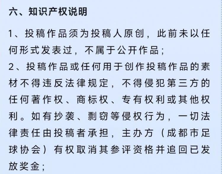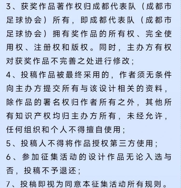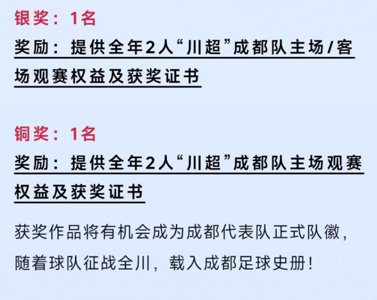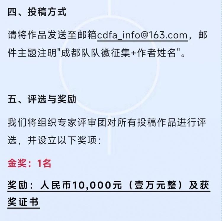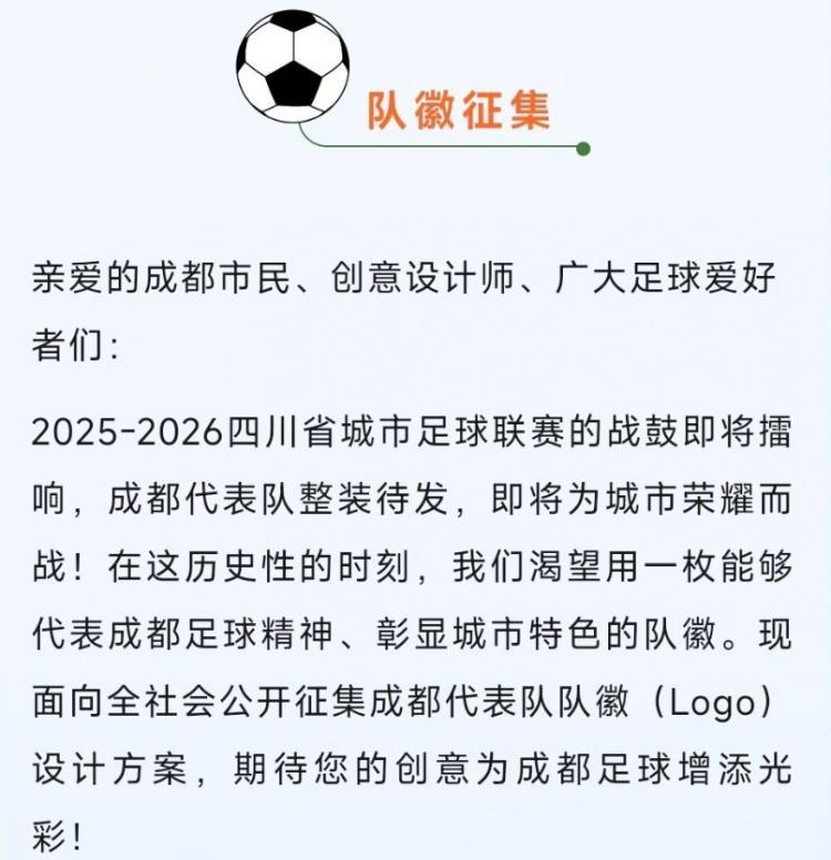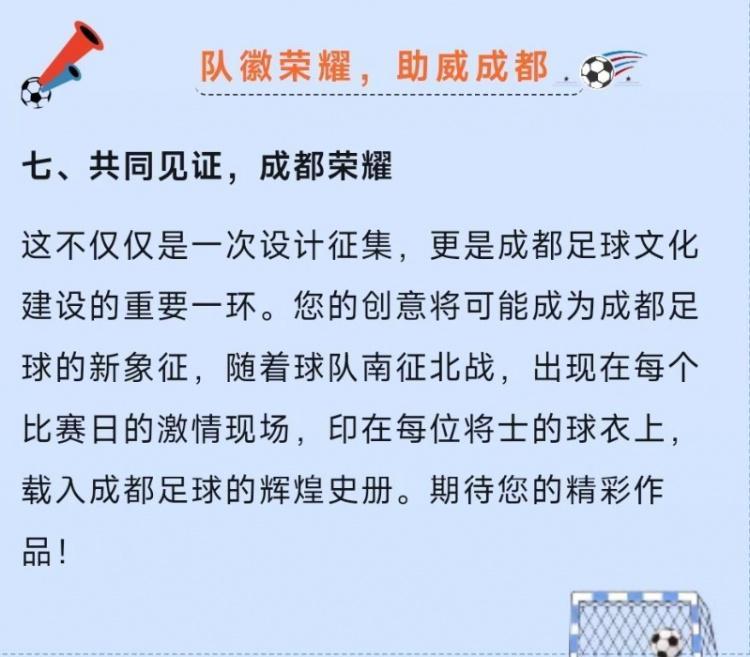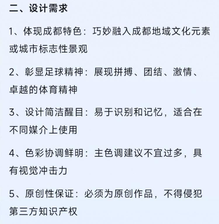 设计需求体现成都特色、彰显足球精神、设计简洁醒目、色彩协调鲜明,且必须为原创作品。投稿时间为9月4日-9月7日。